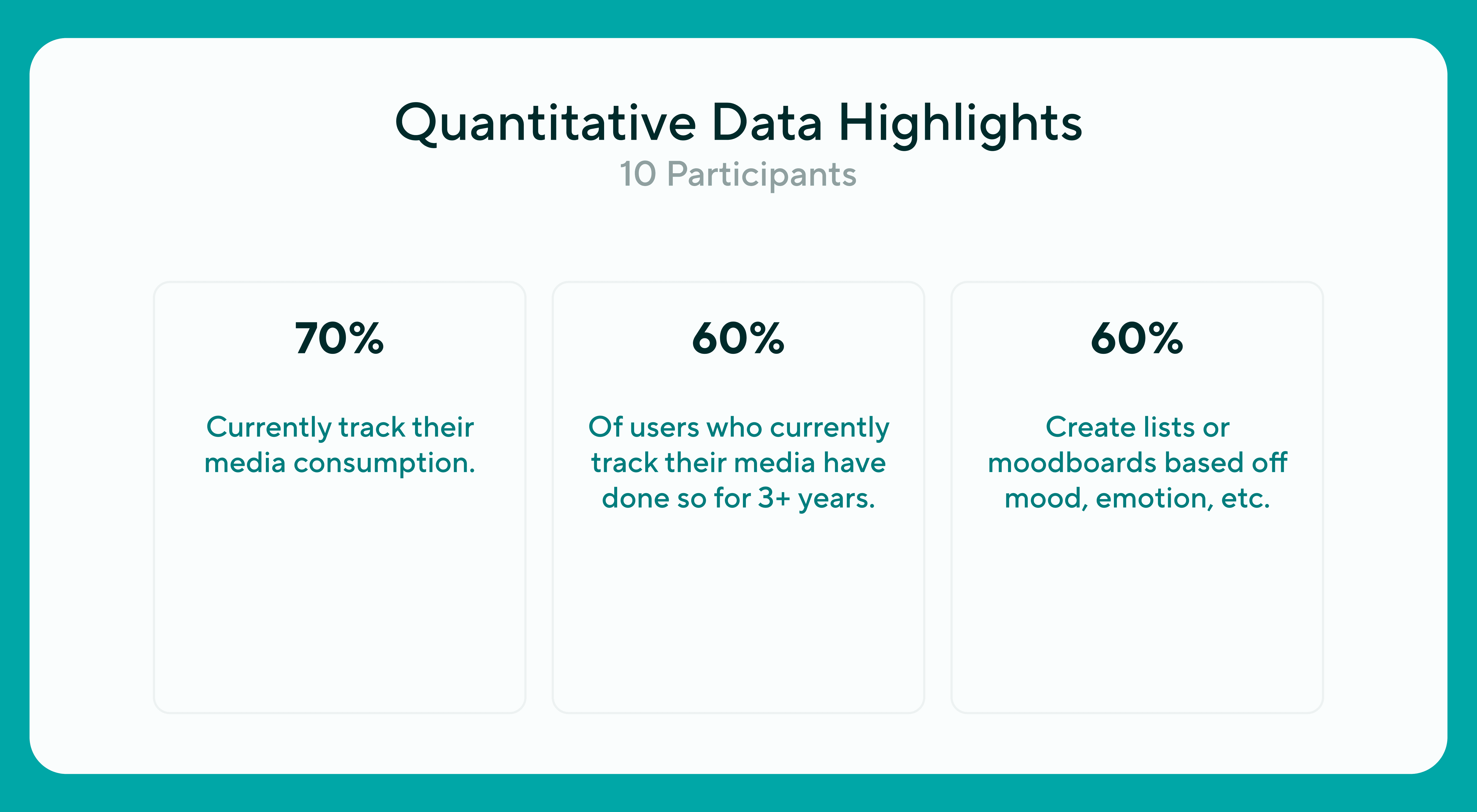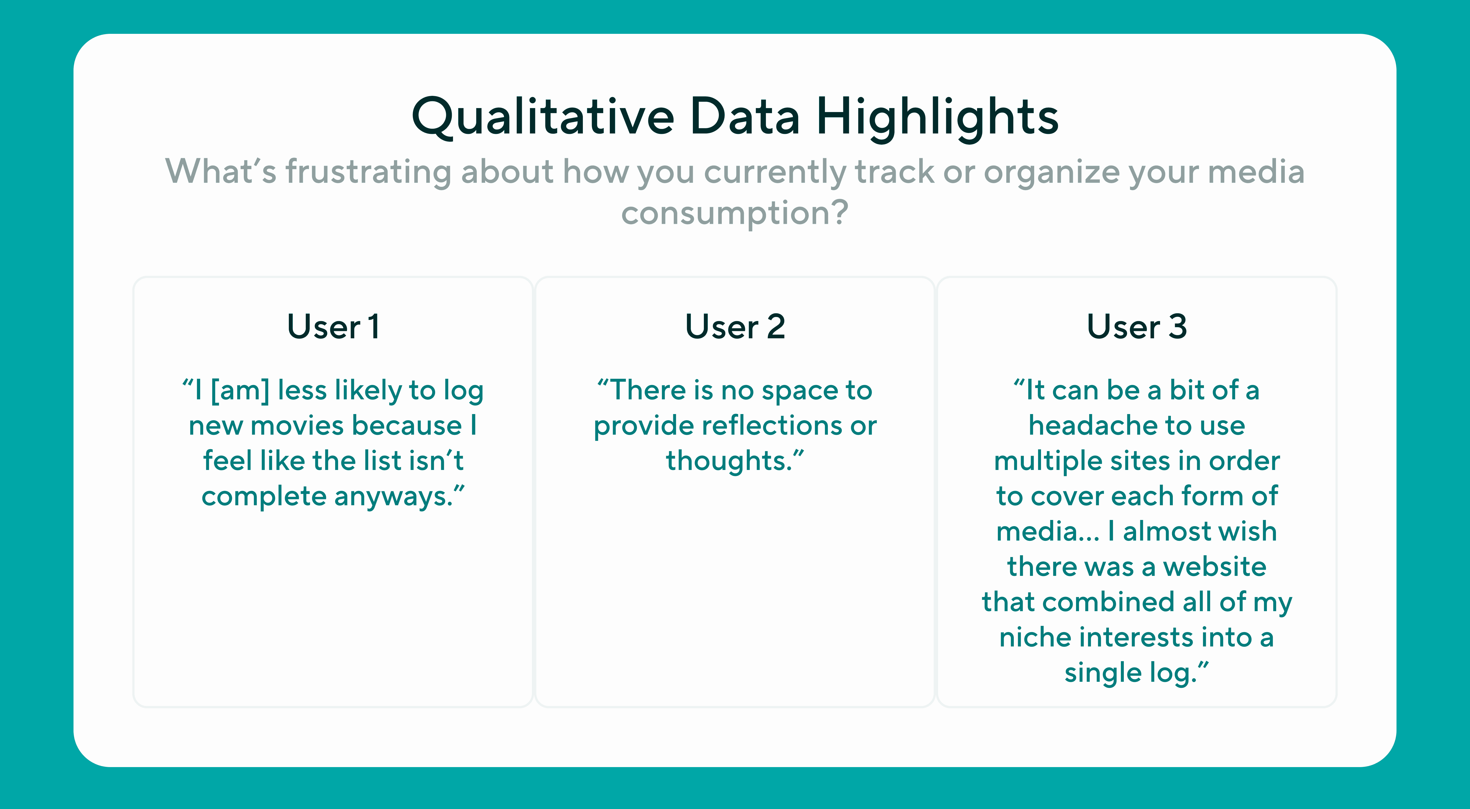 My survey explored the 3 main problems that users face while tracking their media consumption: Tedium, Consistency, and Platform Overload. With busy schedules and competing responsibilities, users frequently cited a lack of time or mental bandwidth to track media consistently, even when they want to. Even worse, juggling multiple apps to stay updated leads to a fragmented, overwhelming experience.