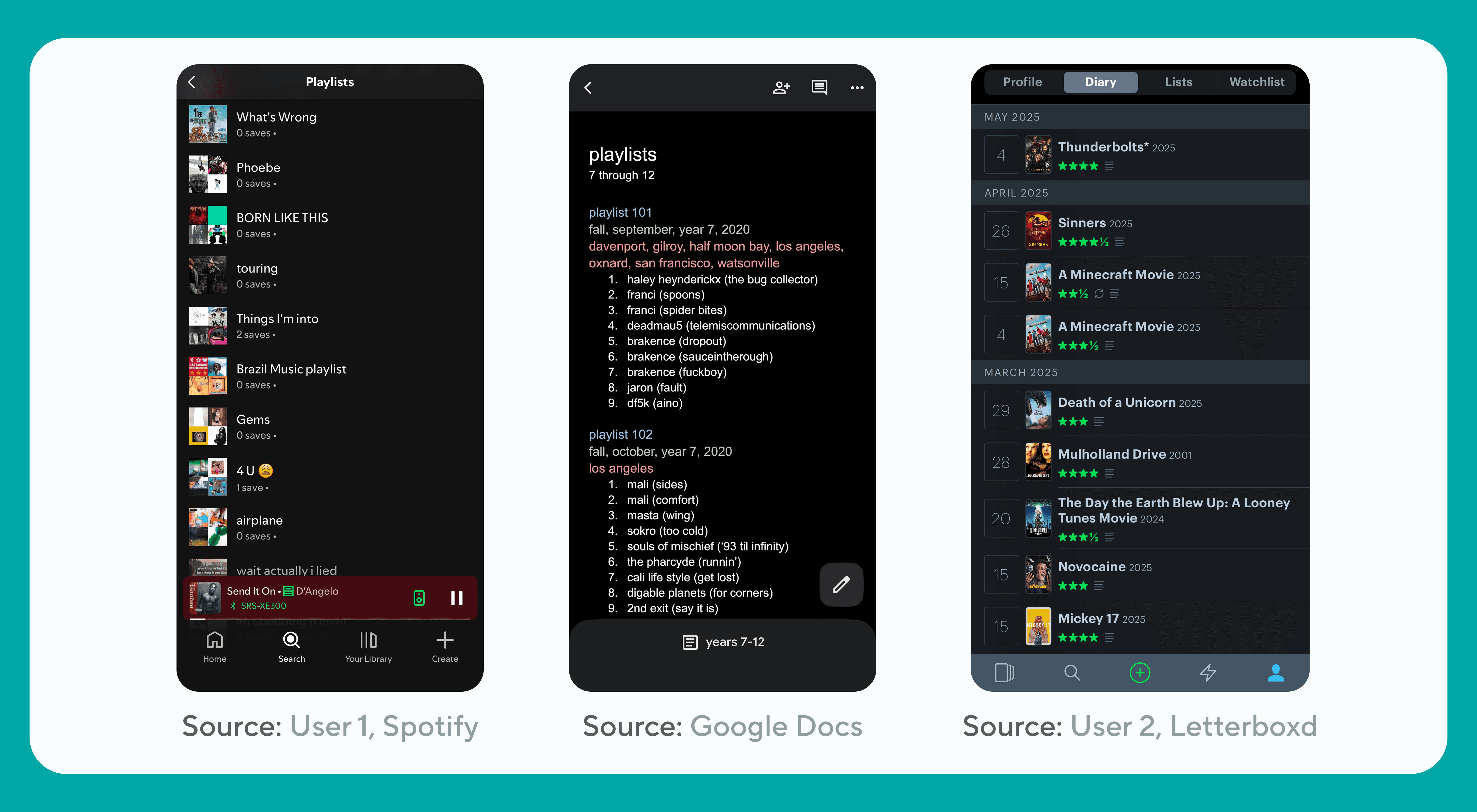 As somebody who’s personally tracked all of the music they’ve ever listened to since 2012 in Google Docs, the manual effort is significant, but scrolling through my life in music has proven invaluable enough to justify the commitment. Recognizing this gap between desire and available tools, I set out to build a platform that automates media tracking across multiple categories while preserving the depth and personalization that makes documenting consumption worthwhile in the first place.
