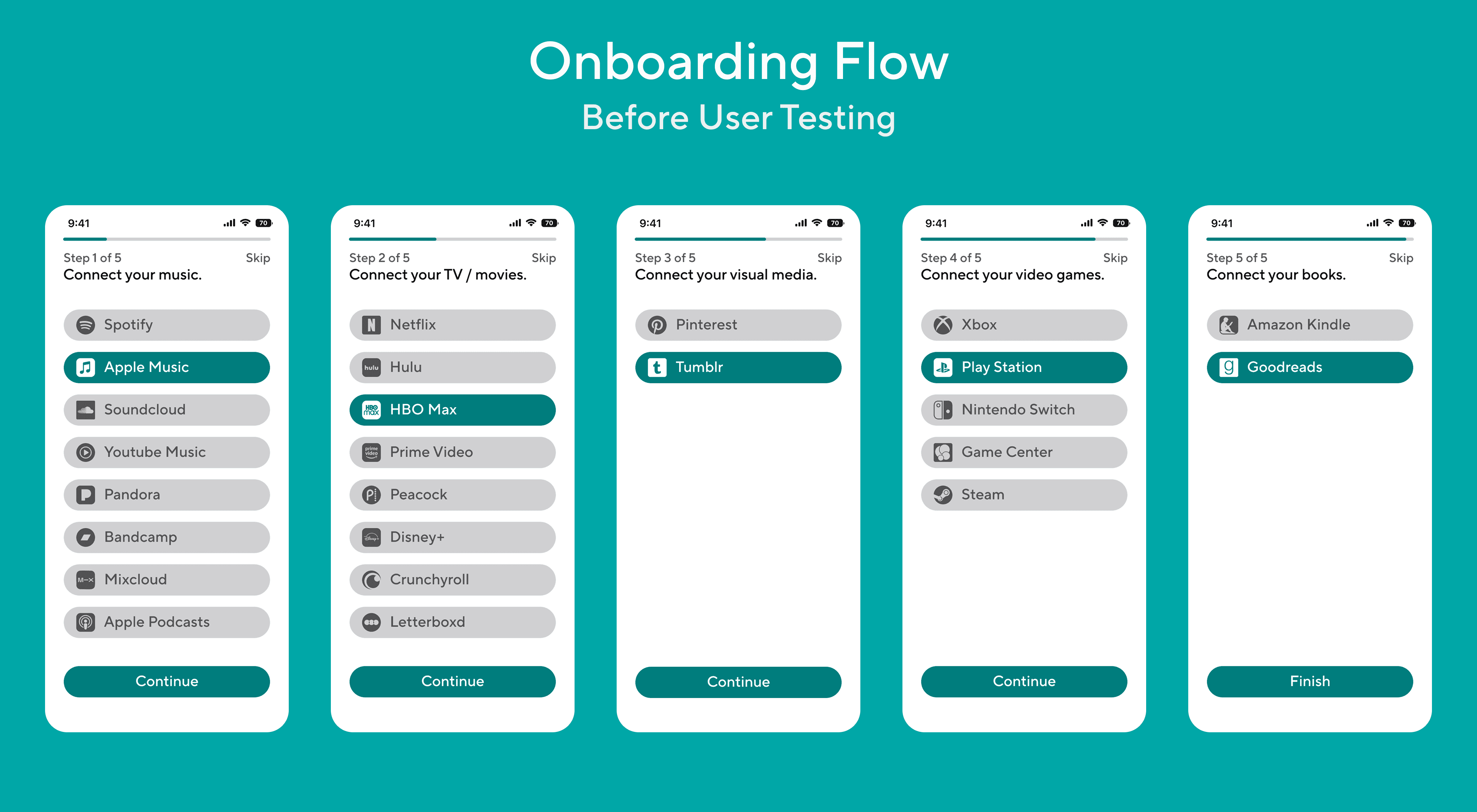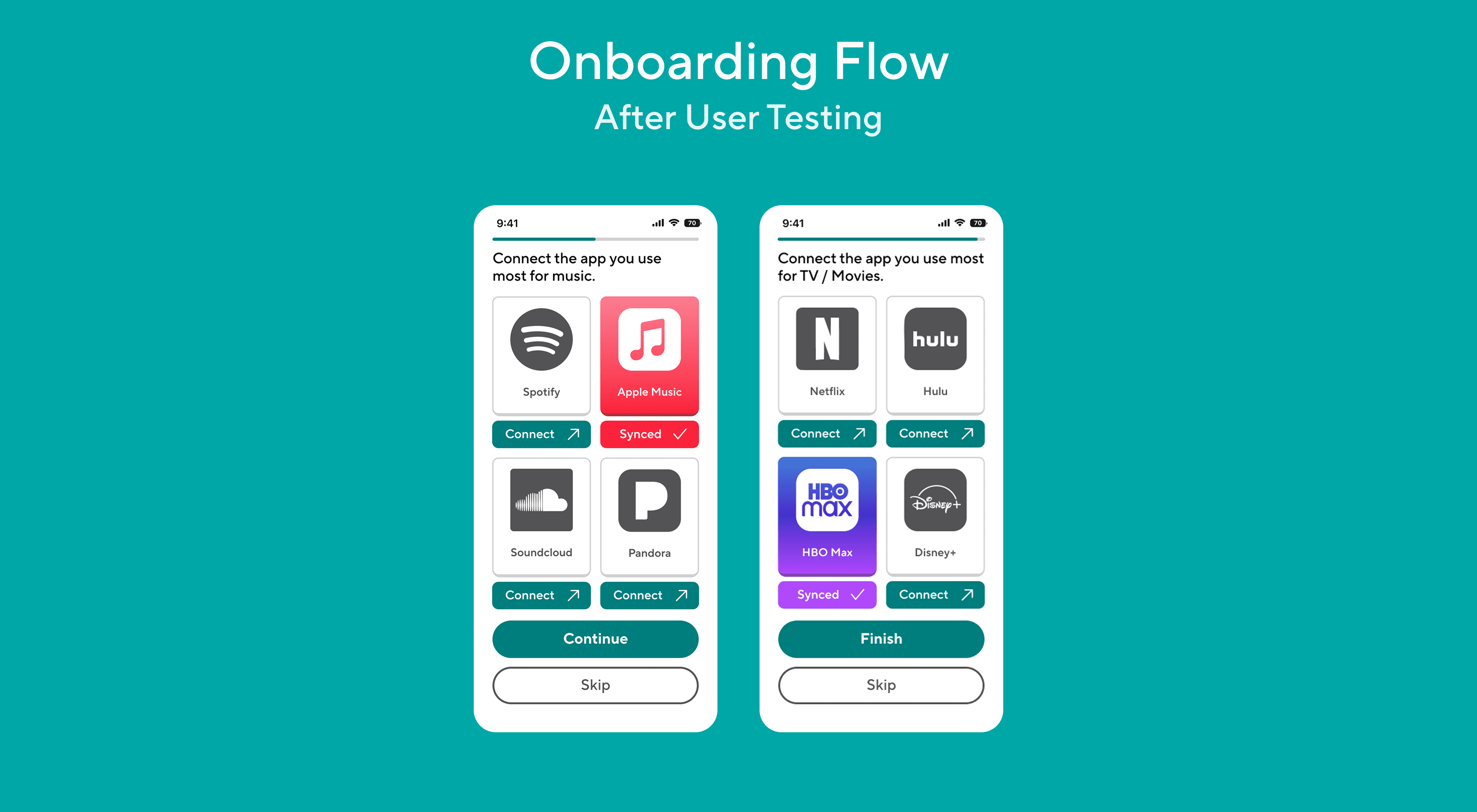 The old onboarding flow took users through every media category, which could quickly become very overwhelming. To speed up the process, we decided to only focus on the two major media categories: Music and TV / Film. Users can always connect more platforms later inside the app.