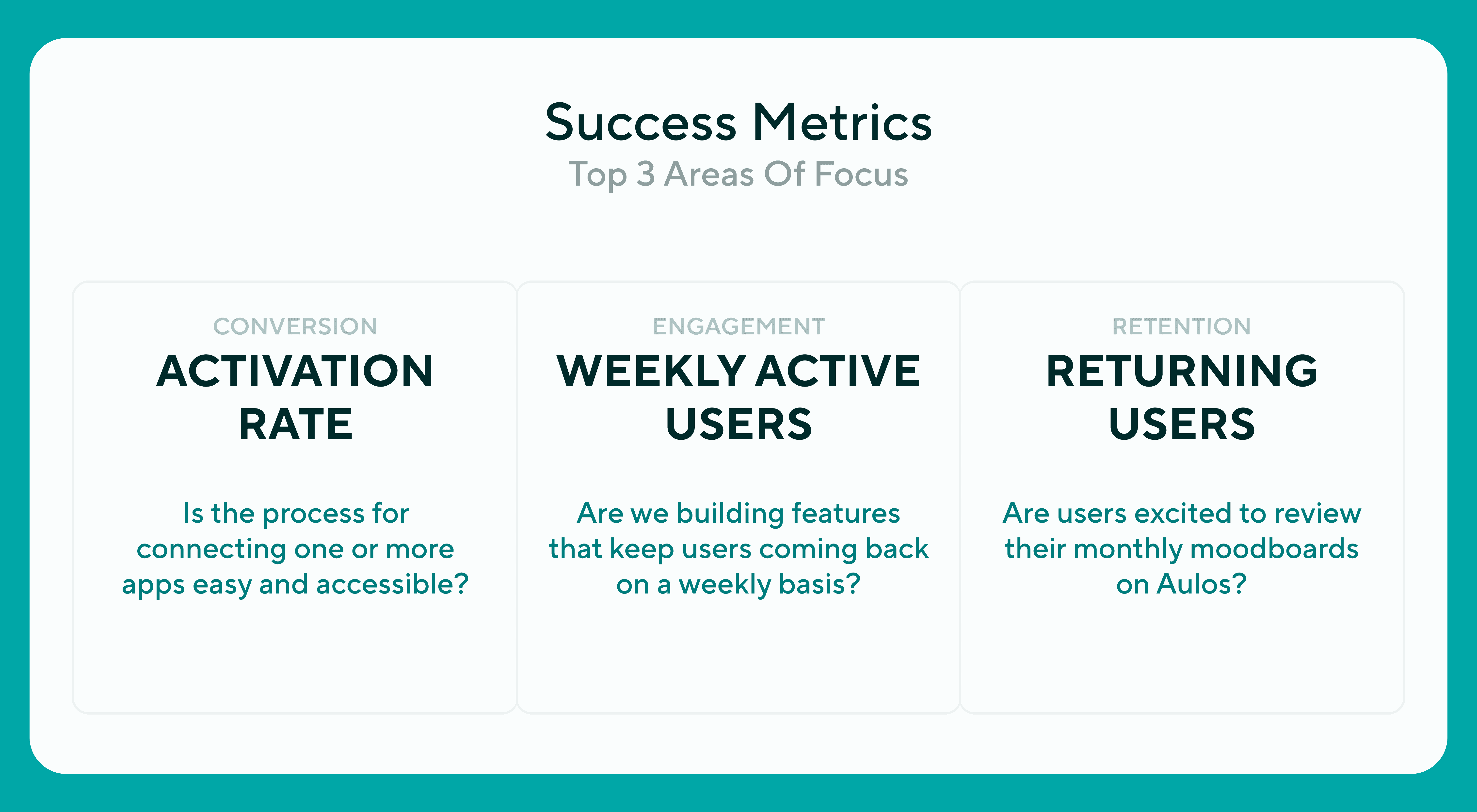 While Aulos is only a concept, it’s still important to consider metrics that would inform where to focus our design efforts as the platform grows. The following metrics will not only help ensure that users are getting the most out of the experience but also validate whether we are building features that foster ongoing engagement and user retention.
